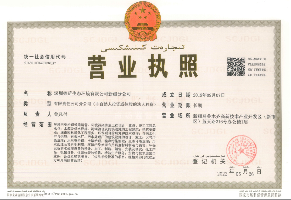 深圳德蓝生态环境有限公司新疆分公司营业执照