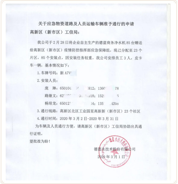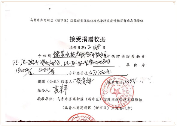 2020年2月28日,德蓝水技术股份有限公司向乌鲁木齐市高新区(新市区)新型冠状病毒感染的肺炎疫情防控指挥部捐赠健康水直饮水机85台,慰问品一批,价值47万余元,用于疫情防疫工作。近日,高新区防疫指挥部特发来感谢函,感谢德蓝的捐赠。