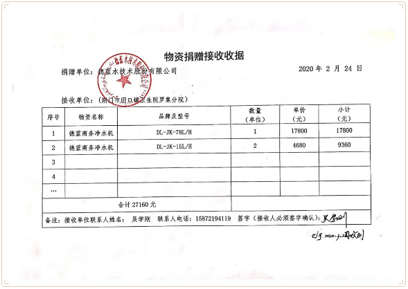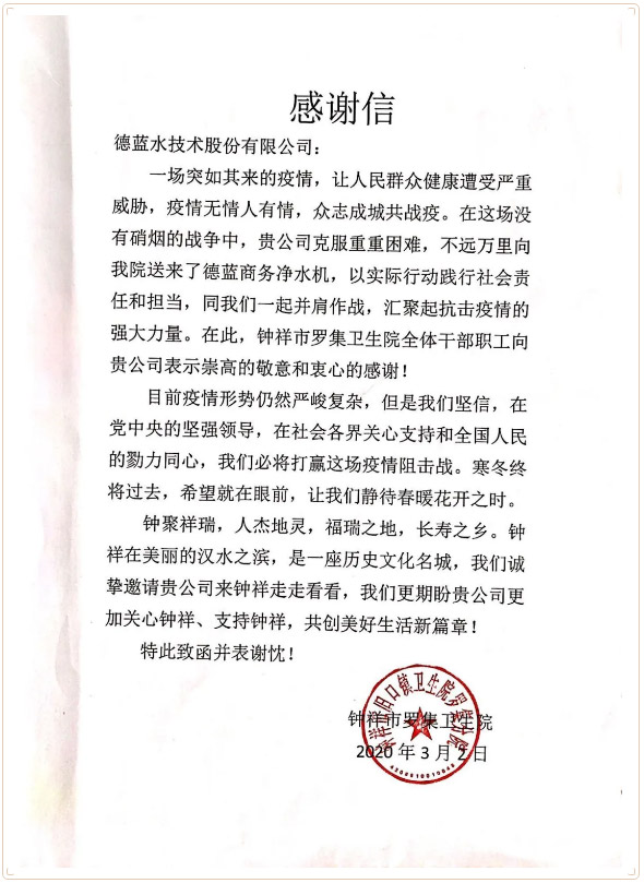 3月2日湖北钟祥市罗集卫生院发来感谢信,感谢徳蓝在危难时刻捐赠的健康水直饮水机。